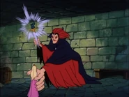 The evil Sybilla, who had long been held captive in a fortress by a wizard’s magic, learns of Bronwen’s uncanny physical resemblance to the Princess Daphne through her magical pet raven, who is able to travel freely and report back to the sorceress. From her raven, she also learns that Princess Daphne and Dirk the Daring visited Crow's Wood to celebrate the festival commemorating Sybilla's defeat by a wizard many years prior. Sybilla lures Bronwen to her by instructing her raven to steal the girl’s comb, resulting in Bronwen following the raven into Sybilla’s fortress. Using both her red gaze and an enchanted brooch, Sybilla hypnotizes Bronwen into impersonating Daphne and manipulating Dirk into stealing the Gryphon’s Stone, the only thing that would permit her to break free from her fortress prison.