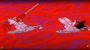 Mordread hides behind the throne of Father Time as he and Baby New Year fire bolts of lightning at Dirk. Mordread plans to drop the magical orb containing daphne into the Vortex of Eternity beneath the throne, but Dirk grabs a golden plate, deflecting two time rays that strike Mordread. She momentarily transforms into a baby after being struck by the first, then quickly ages then turns to ash due to the effects of the second. Dirk leaps into action and grabs the magical orb before it falls into the Vortex of Eternity.
