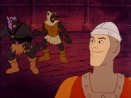 The Shadmocks helped Biralla to capture the town of Avalon and imprison Gelda, the daughter of Mayor Rukh. When Dirk the Daring leads a rescue mission, Biralla instructed the Shadmocks to allow the heroes to free Gelda, in order that they might follow her to the magical Pool of Youth. The Shadmocks tracked the heroes in their quest and attempted to ambush Dirk and Princess Daphne in the ancient city that hides the pool. Biralla ordered the Shadmock Commander to charge at a de-aged Dirk, but the diminutive knight tripped him, causing him to fall into the pool and de-age into a playful puppy. A second Shadmock was also de-aged into a puppy after being splashed by Daphne. After the arrival of The Sandman, the effects of the pool were reversed, returning all characters to their proper ages. Once Biralla was defeated by Dirk, the remaining Shadmocks ran away in fear.