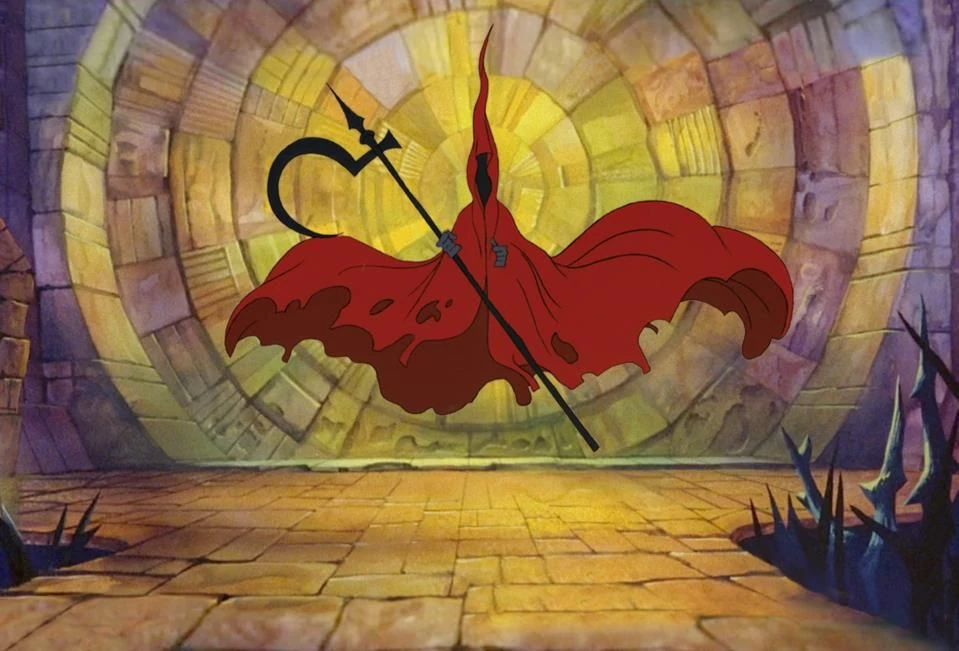 The Shapeshifter, also known as the Grim Reaper (and less popularly known as the Cloaked Spectre[1] and the Thorn Lord) is a mysterious recurring villain in the Dragon's Lair franchise. Presumably a servant of Mordroc, it first appears in the original Dragon's Lair, waiting for Dirk the Daring to cross a narrow bridge while dodging twin whirling batons. A singe blow from Dirk’s Sword seemingly vanquishes the spectral villain, but Dirk must continue to evade the fast-growing thorns before he can exit the room.