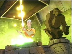 In the episode “The Smithee’s Haunted Armor,” Dirk and his allies seek out a blacksmith who could forge a new suit of armor for King Ethelred. Meeting Morrigu in disguise of an old man called “Walker,” they journey to Smithee’s Knoll, concealed beneath the Glass Castle of Dagda and Morrigu. Morrigu and Dirk discover the hammer has gone missing. After awakening the Smithee by placing the blade of his sword over the enchanted forge, Dirk is attacked by the magical weapons and golden armor. Now free to leave the Knoll, the Smithee runs into a nearby village and wreaks havoc. Morrigu steals the hammer from the residence of Dagda, who lives secretly as a fisherman. Morrigu uses the hammer to call the Smithee to engage in a battle with Dirk, but the knight defeats them both and acquires the golden armor for the king.
